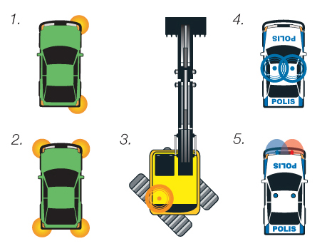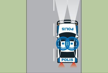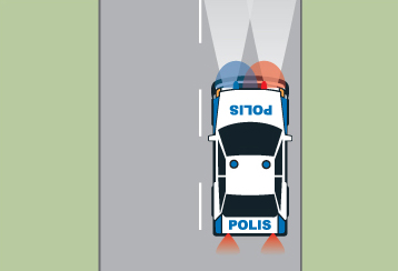 | Stopptecken som används av polisen är framåtriktade lyktor med växelvis blinkande blått och rött ljus. Om du ser ett fordon bakom dig som visar denna signal så ska du köra in till vägkanten och stanna framför polisfordonet. |